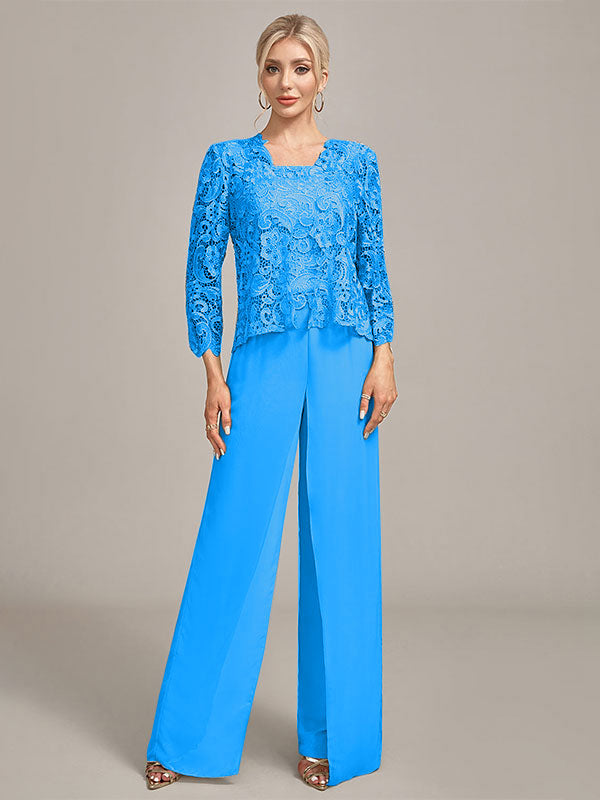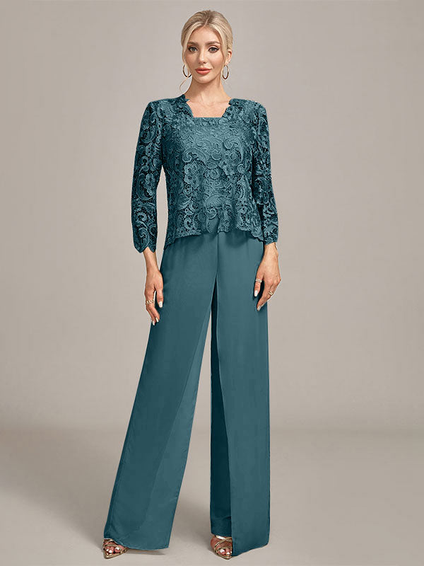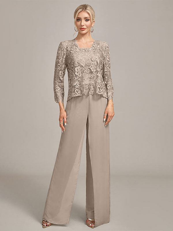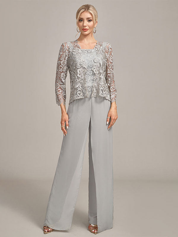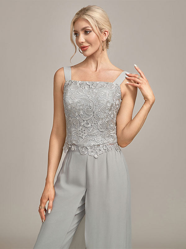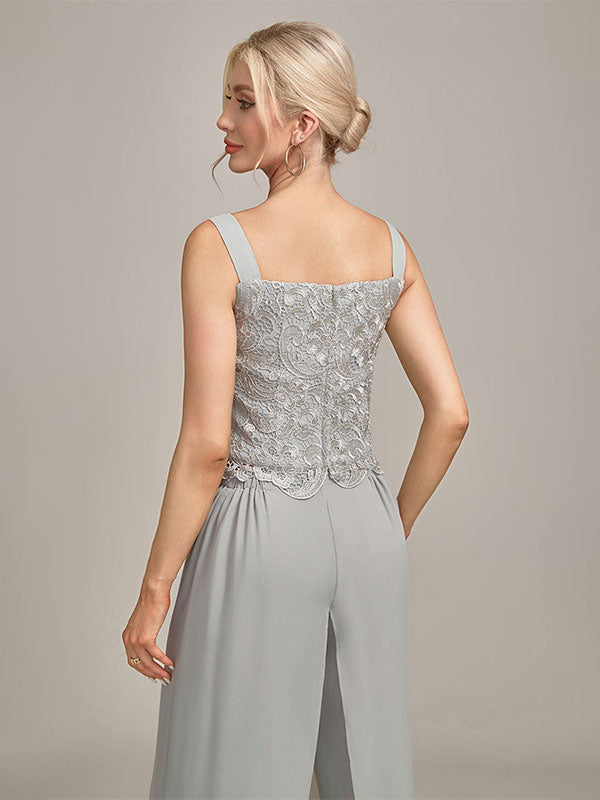 Silver Chiffon Pant and Lace Top Mother of The Bride Wide Pant Suits