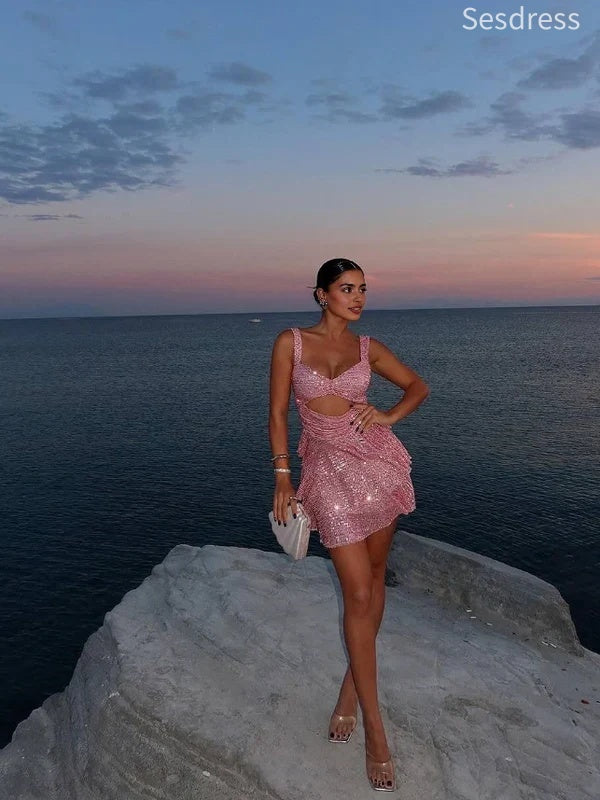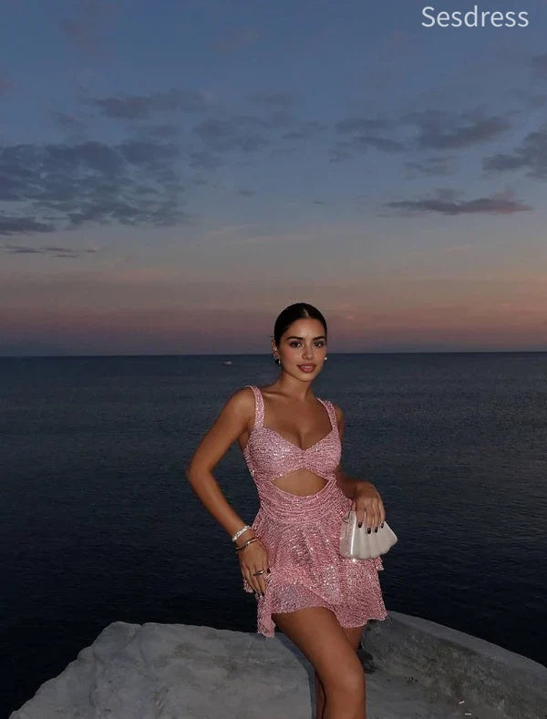 Sparkly Sequins Pink V-neck Straps A-line Short Mini Dress Homecoming Dress
