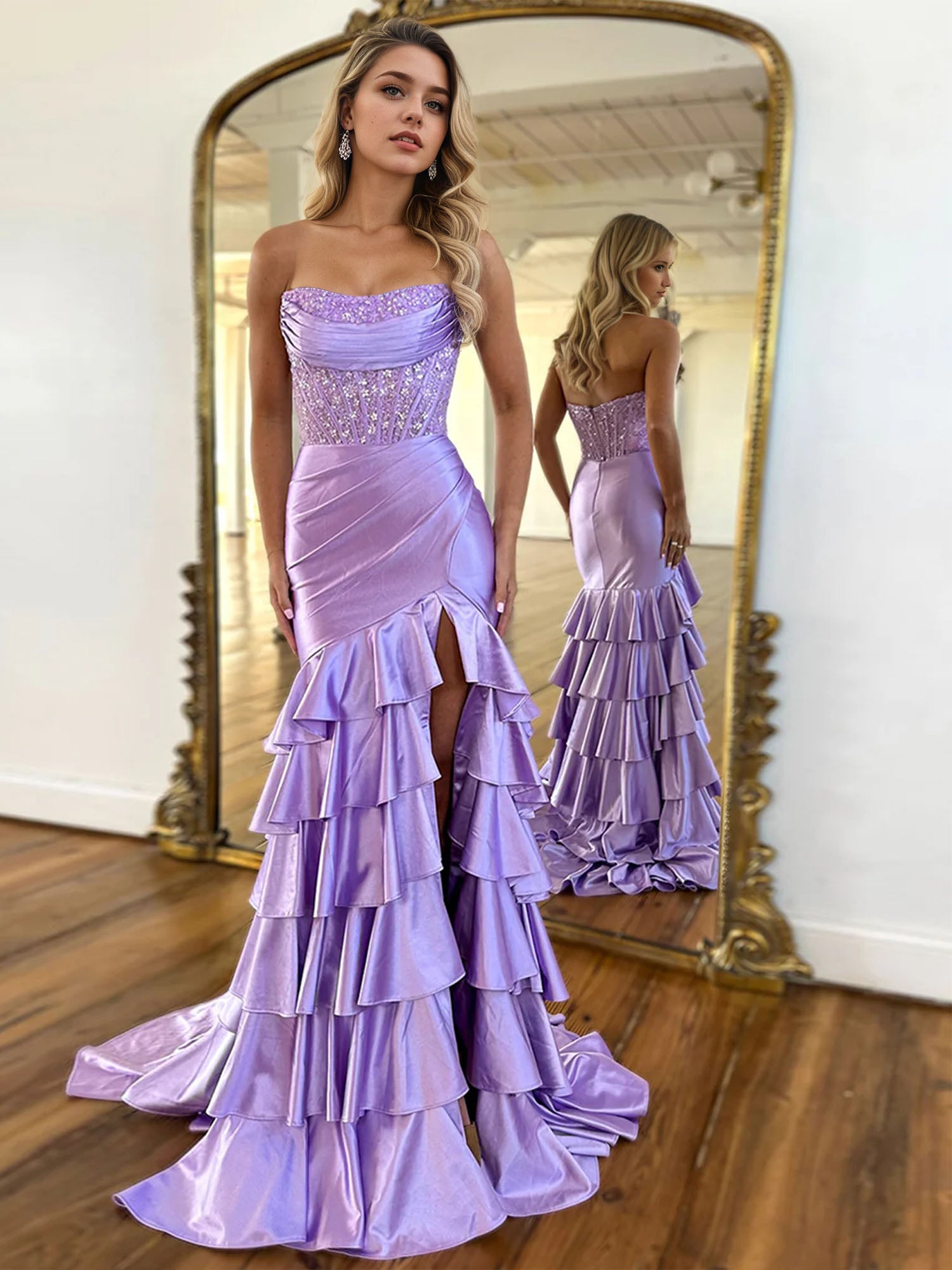 Tiered Strapless Prom Dresses with Applique Mermaid Sweet 16 Dress
