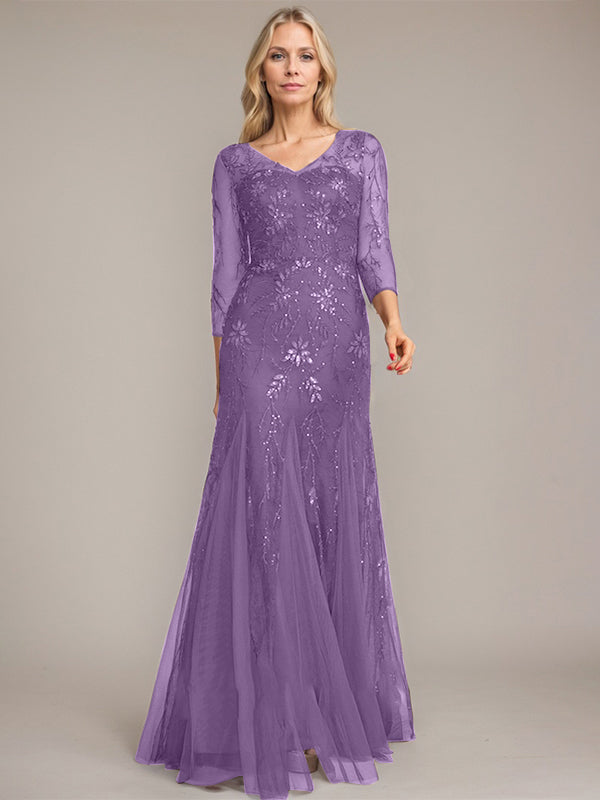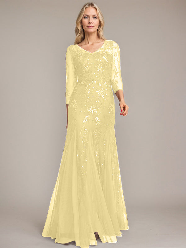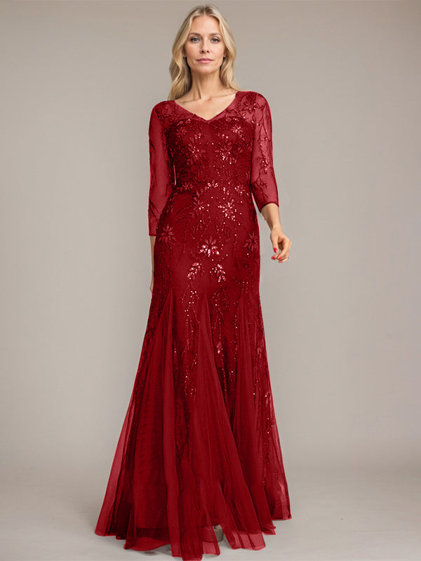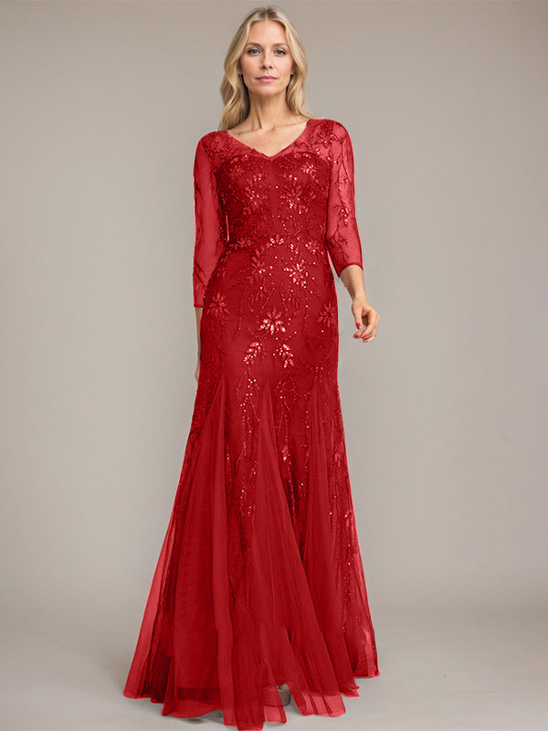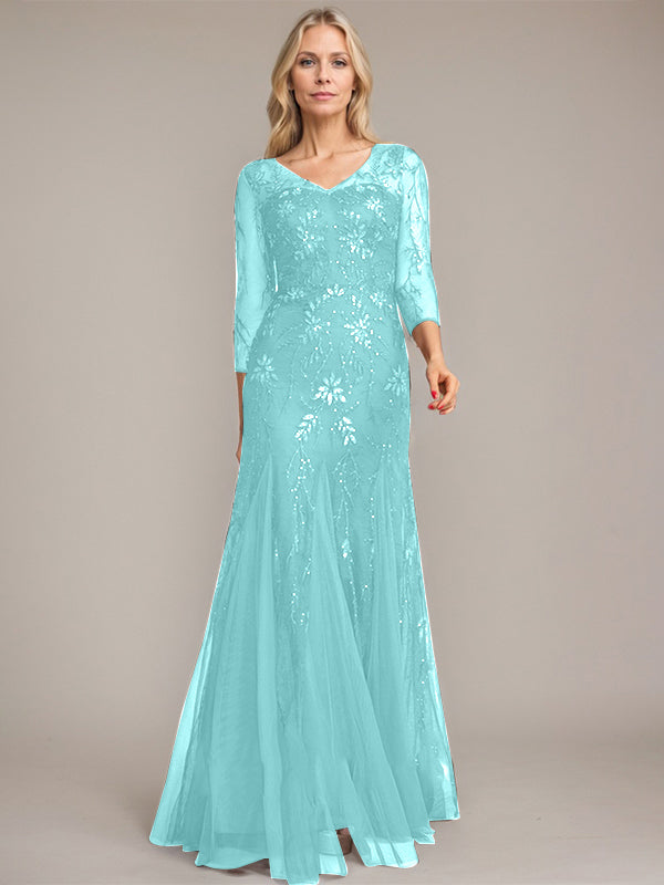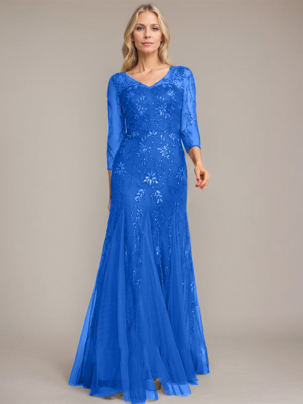 Trumpet/Mermaid Illusion V-Neck Floor-Length Tulle Sequin Lace Mother of the Bride Dress