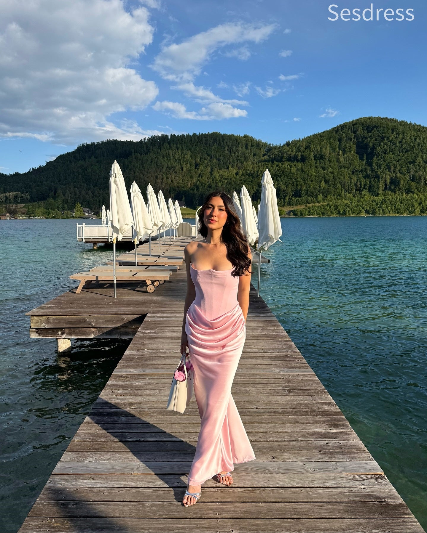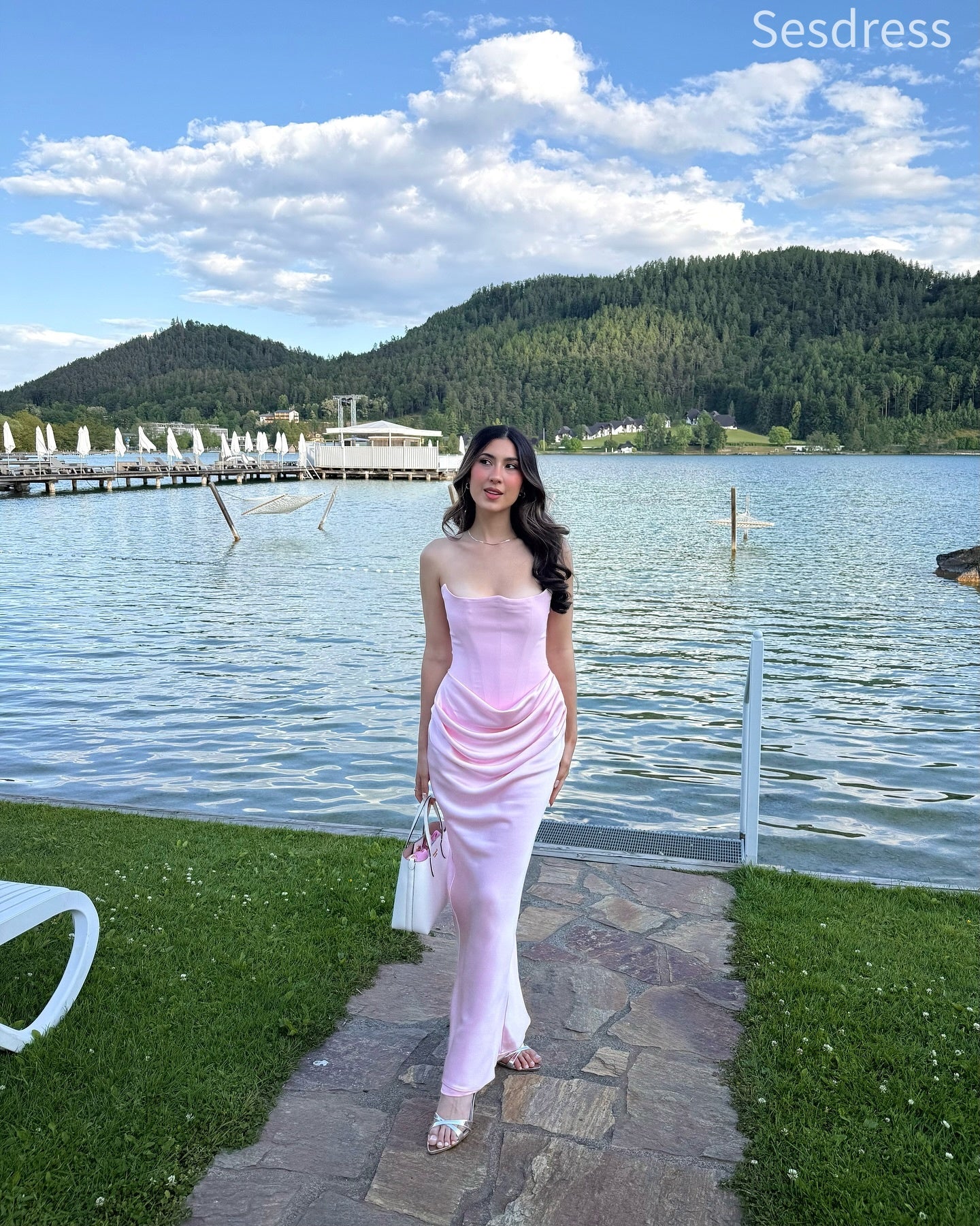 Unique Neck Pink Strapless Pleats Mermaid Wedding Guest Dress,Prom Dress